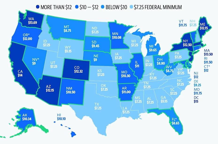 The federal minimum wage is $7.25 per hour. The hourly minimum wage numbers of different states are shown below: